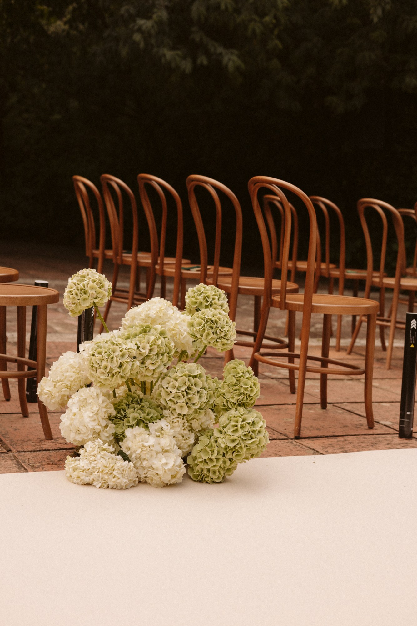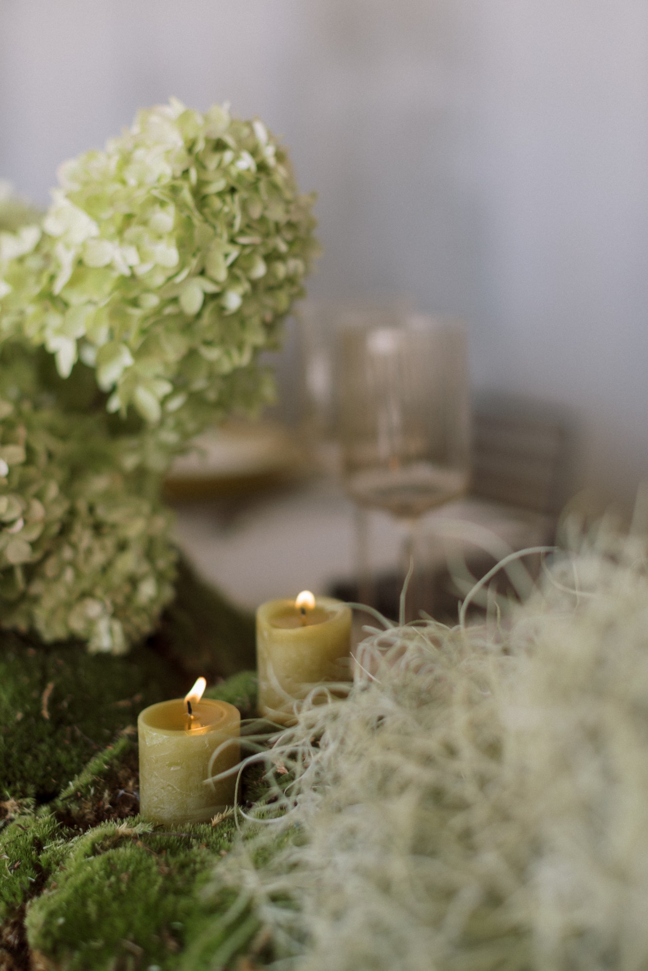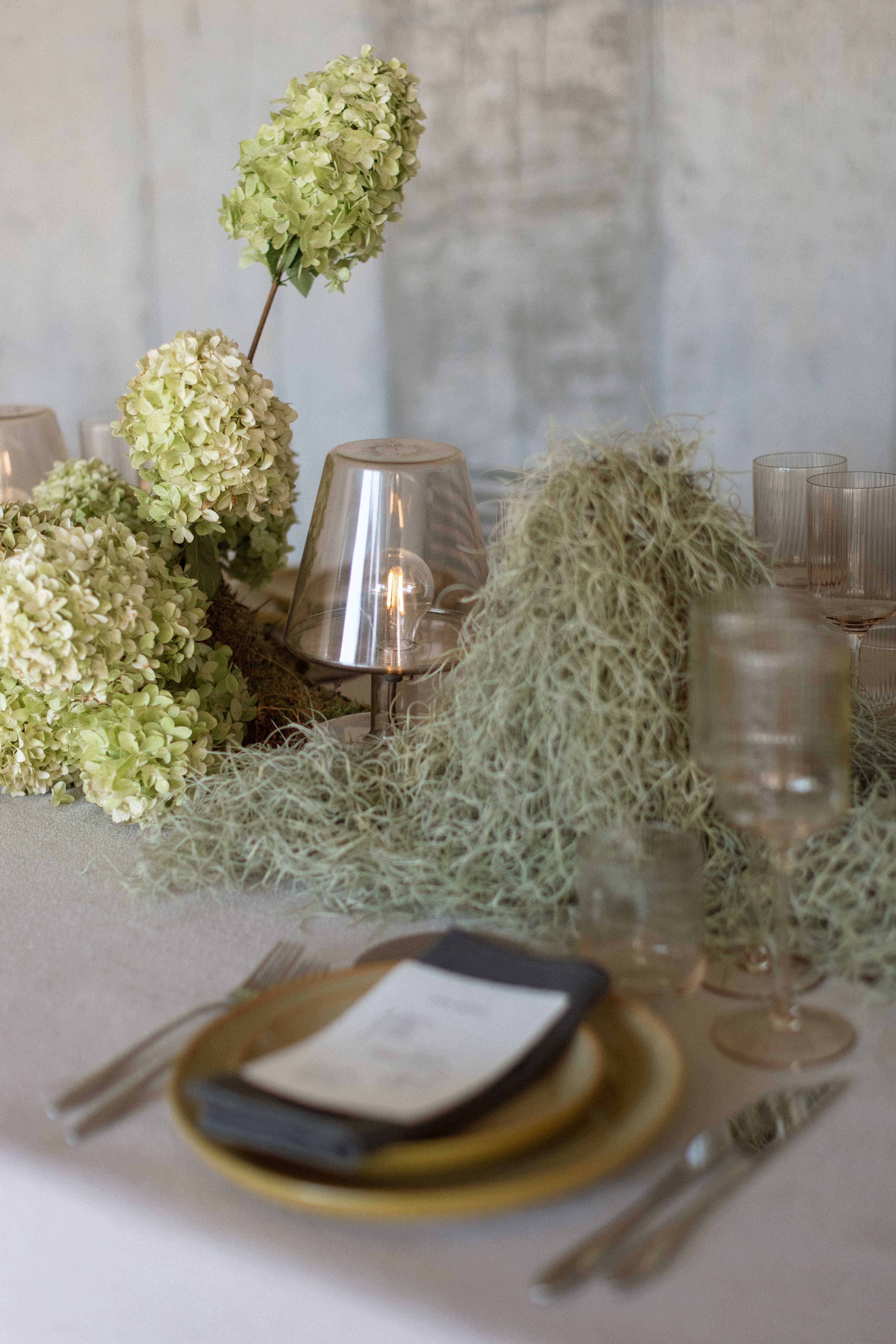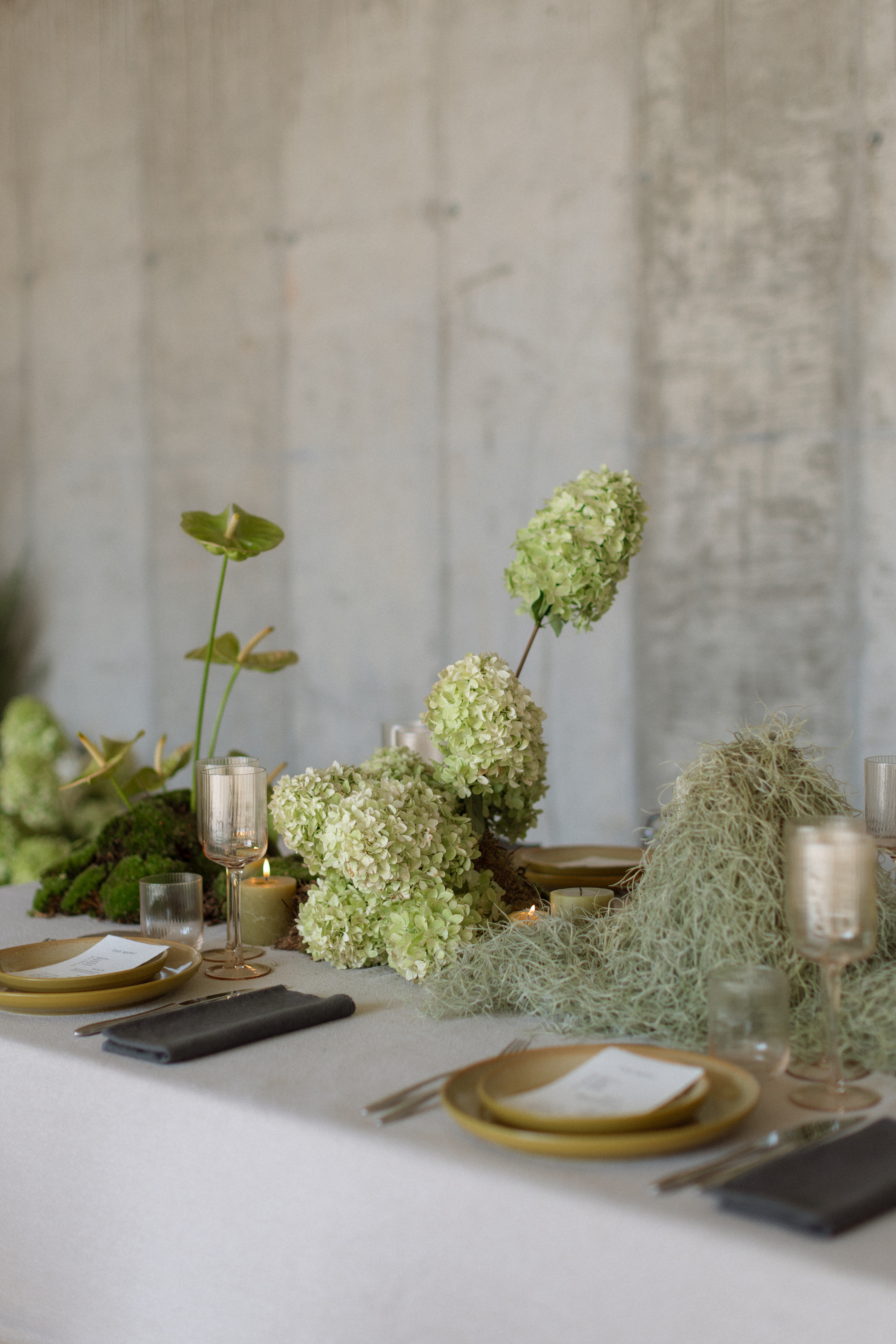 The florals were by Yolanda from Best Day Ever and she worked her magic, pulling inspiration from the venue’s beautiful lake and surrounding greenery. We wanted the space to feel like it was flowing right into nature, so we kept it organic, timeless, and, of course, green. The table scape played with contrasts; moss and sculptural florals with engraved JDN Paper coasters.