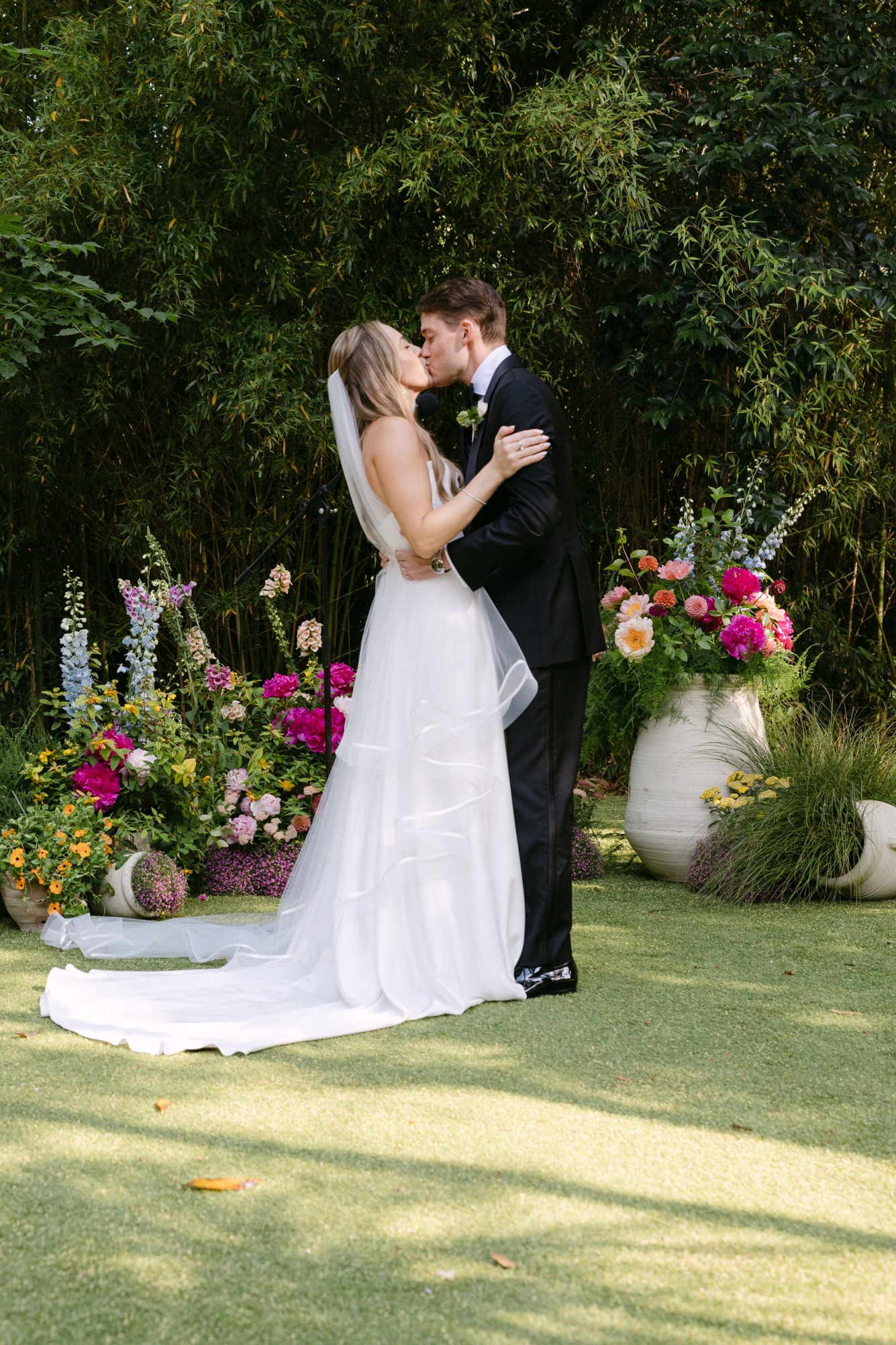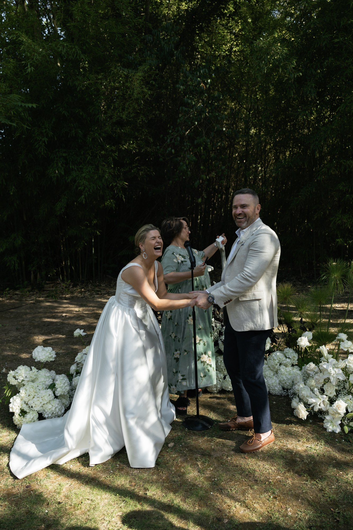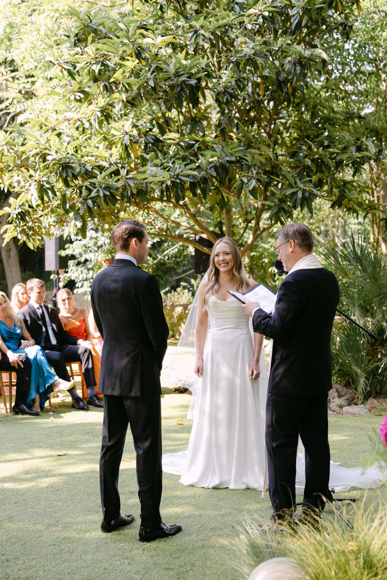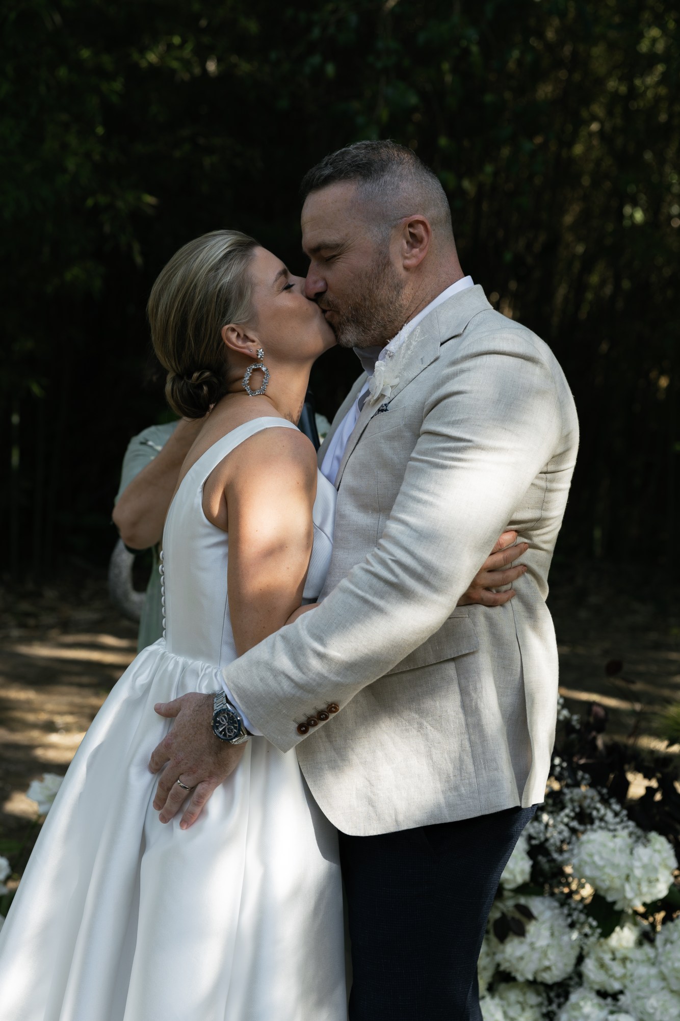 The florals were by Yolanda from Best Day Ever and she worked her magic, pulling inspiration from the venue’s beautiful lake and surrounding greenery. We wanted the space to feel like it was flowing right into nature, so we kept it organic, timeless, and, of course, green. The table scape played with contrasts; moss and sculptural florals with engraved JDN Paper coasters.