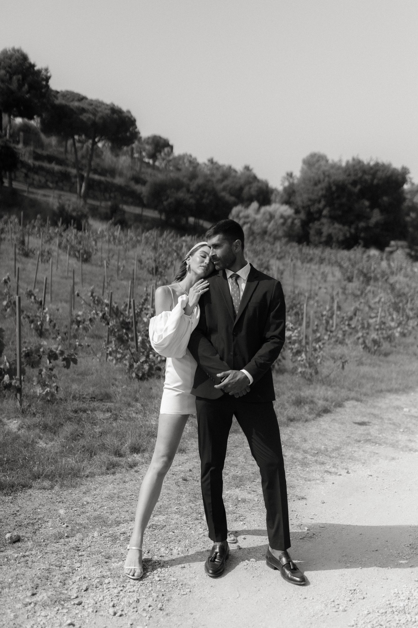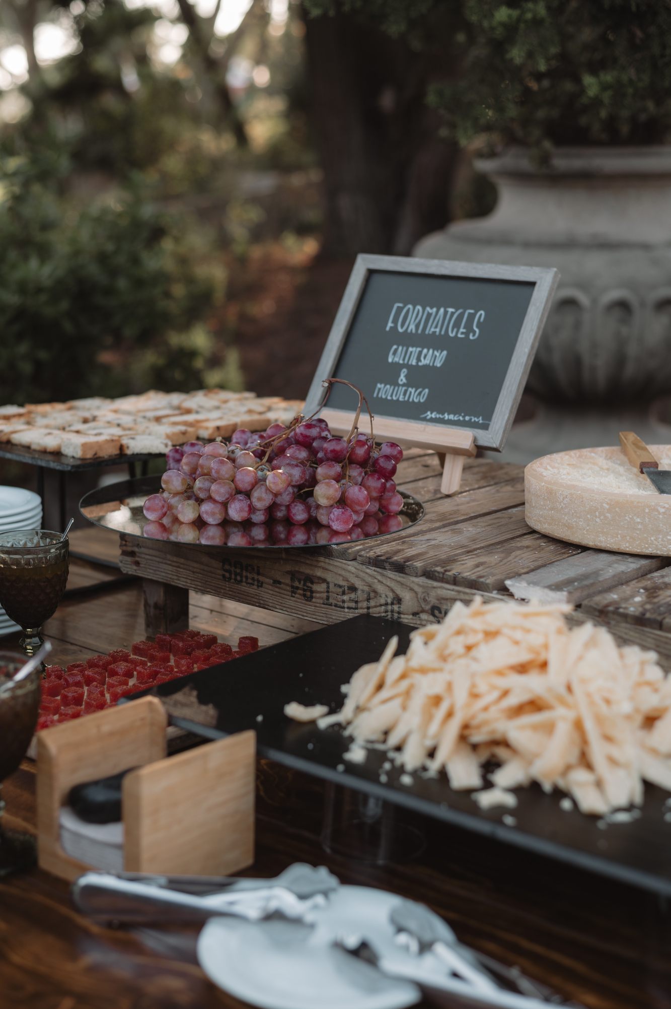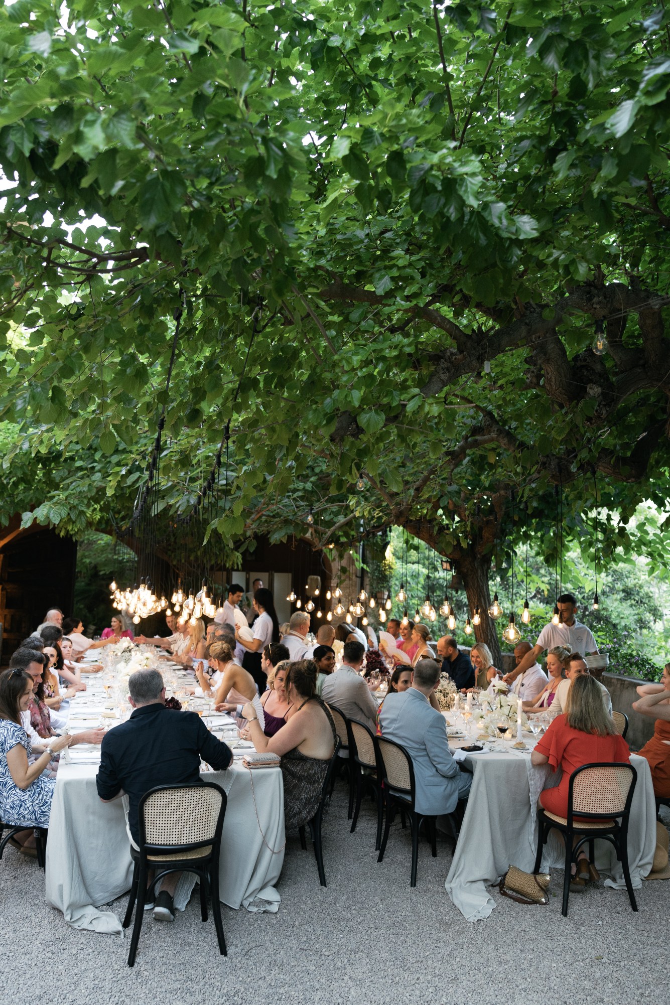 We love blending timeless with modern, so we kept the design effortless yet elegant. Amy wanted loads of lightbulbs from the trees (an idea we we’re fully onboard with), and it really brought an extra special and romantic touch to the dinner. For the florals, we worked closely with our favourite florist, Yolanda from Best Day Ever, who crafted sculptural centrepieces with florals and grapes. Since we’re so close to the Penedès wine region, we love weaving grapes into our designs. Behind the lens, capturing the whole day beautifully, was the talented Marcos Sanchez.