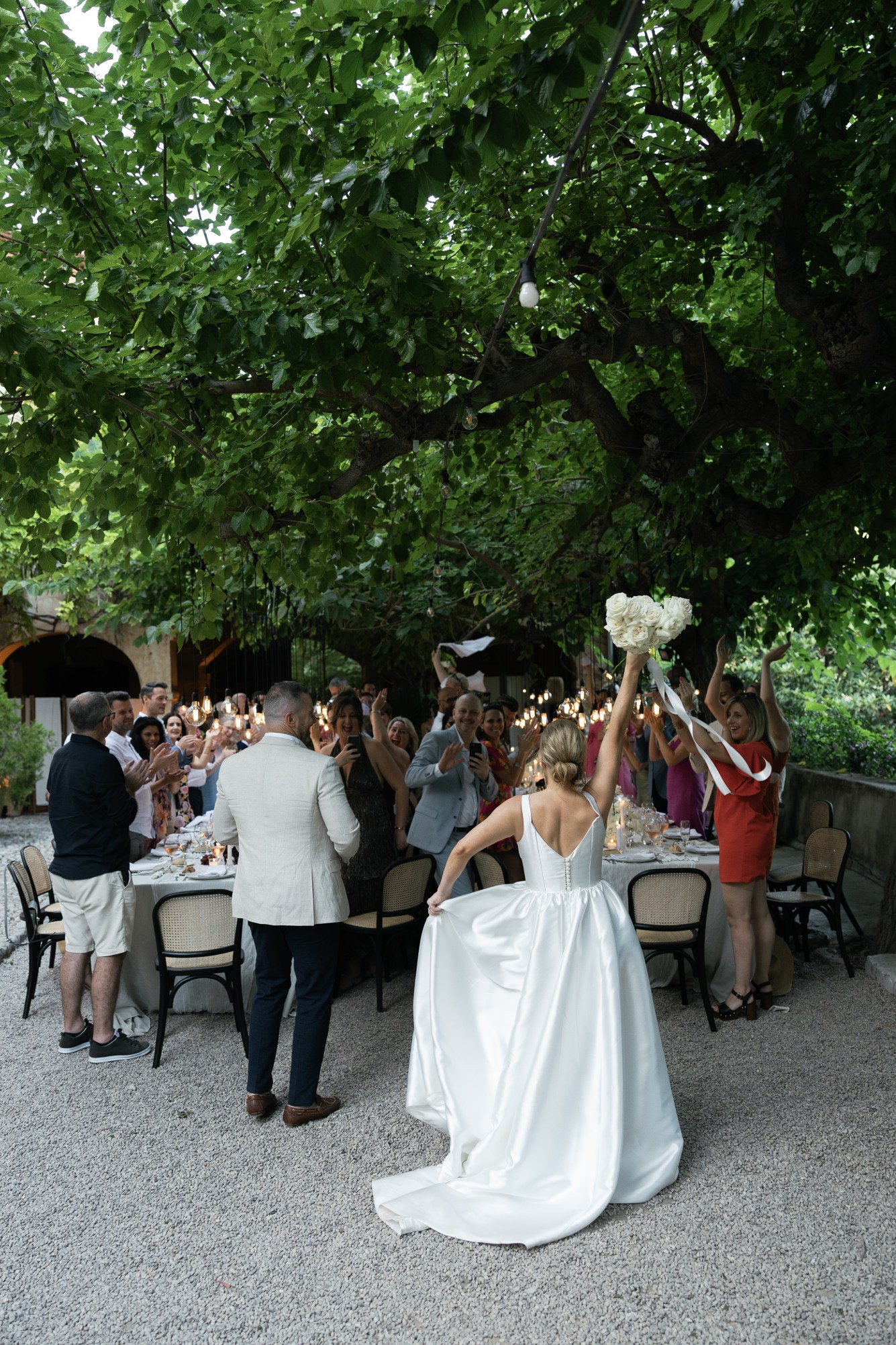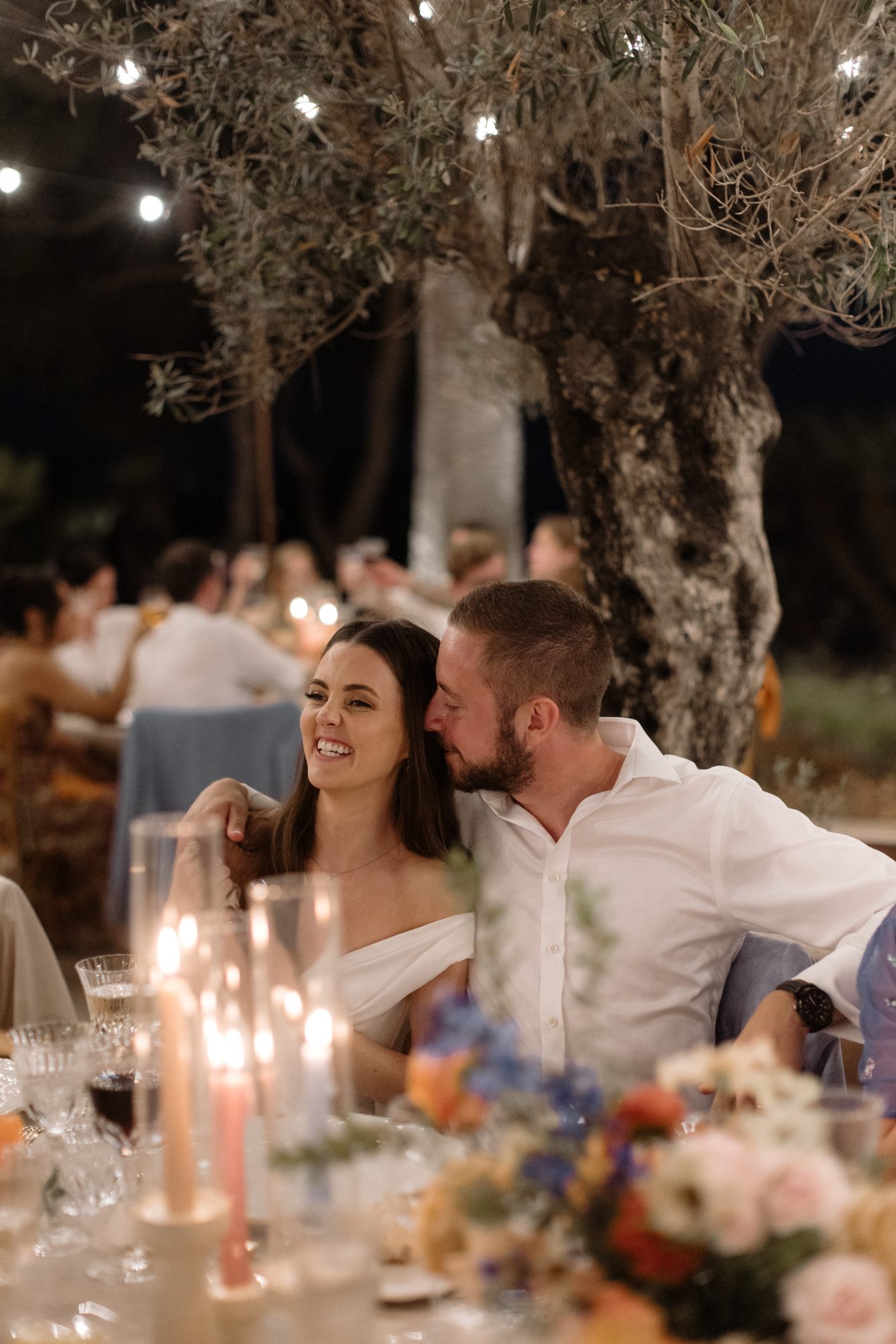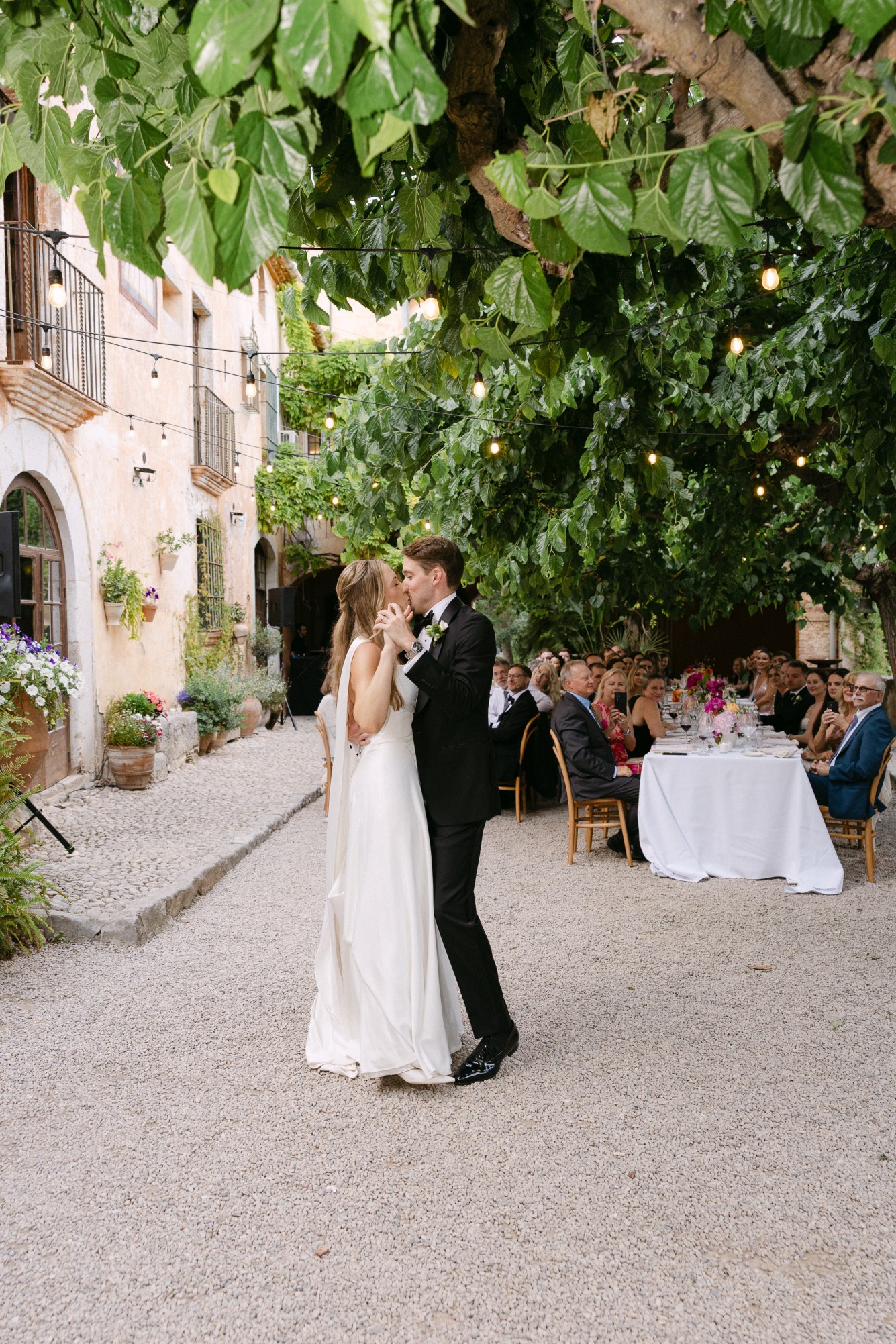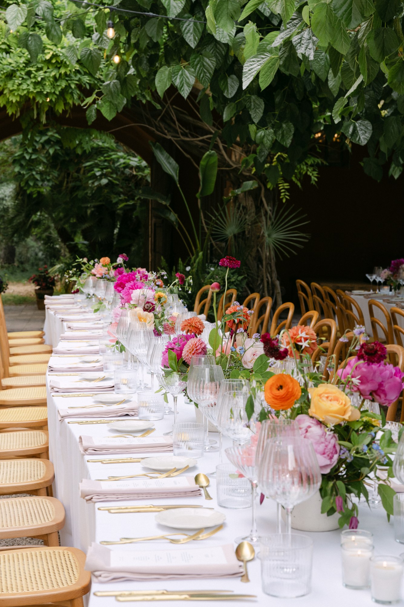 We love blending timeless with modern, so we kept the design effortless yet elegant. Amy wanted loads of lightbulbs from the trees (an idea we we’re fully onboard with), and it really brought an extra special and romantic touch to the dinner. For the florals, we worked closely with our favourite florist, Yolanda from Best Day Ever, who crafted sculptural centrepieces with florals and grapes. Since we’re so close to the Penedès wine region, we love weaving grapes into our designs. Behind the lens, capturing the whole day beautifully, was the talented Marcos Sanchez.
