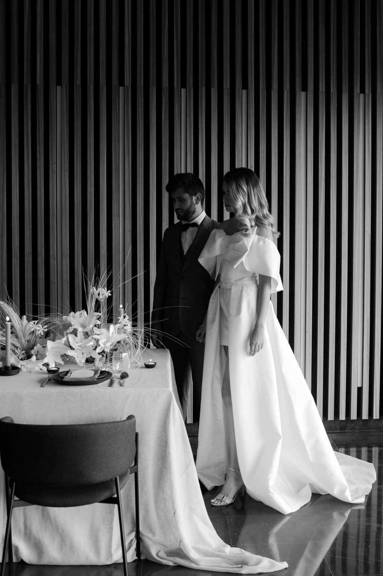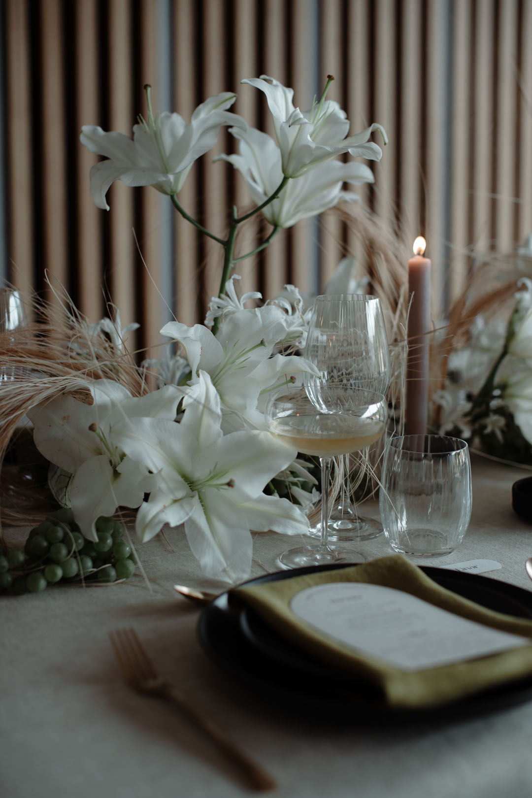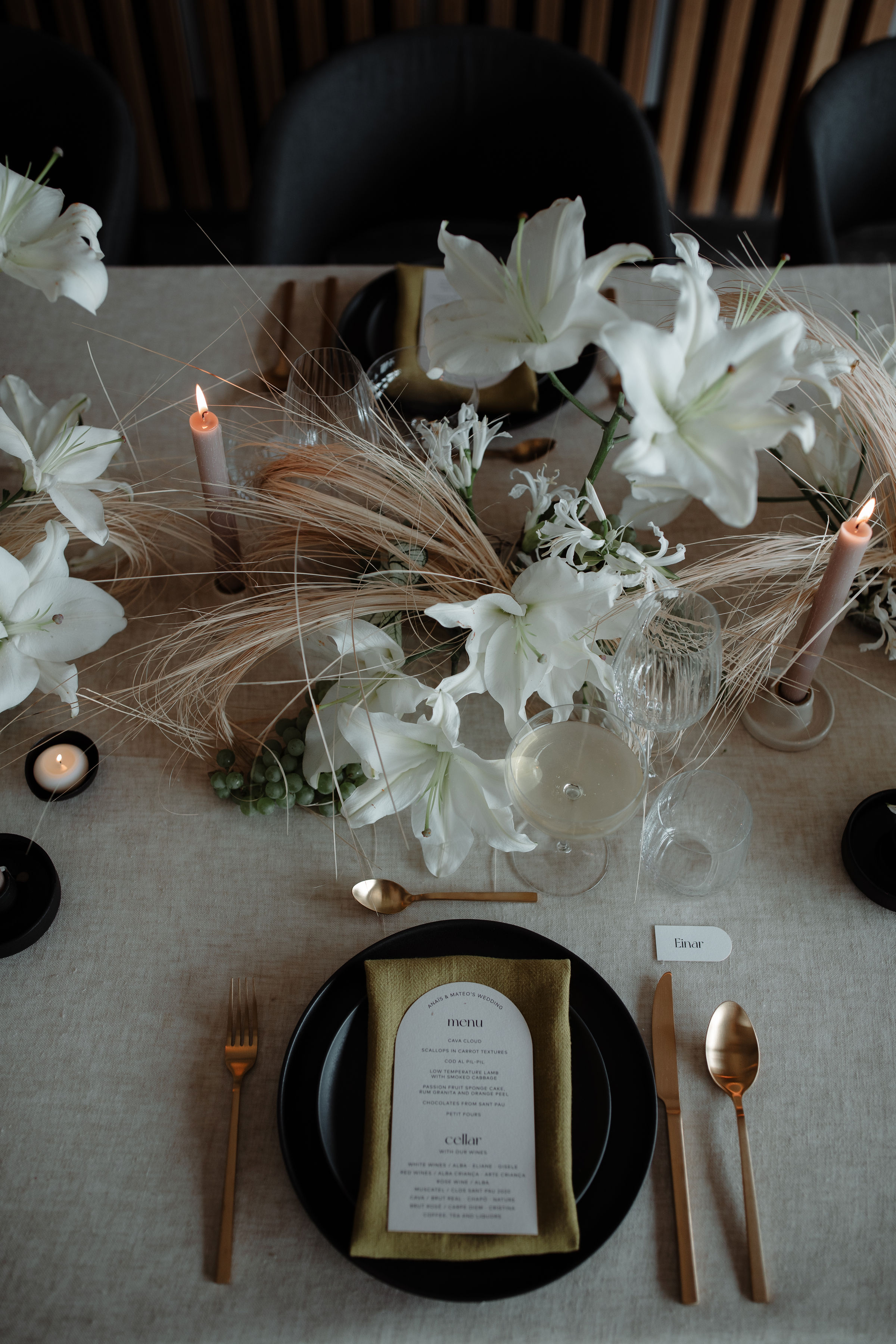 We went for a minimalist design, letting the black tableware and white lilies do all the talking. It turned out exactly how we imagined, and we were beyond thrilled when it was featured on Love My Dress in 2022.